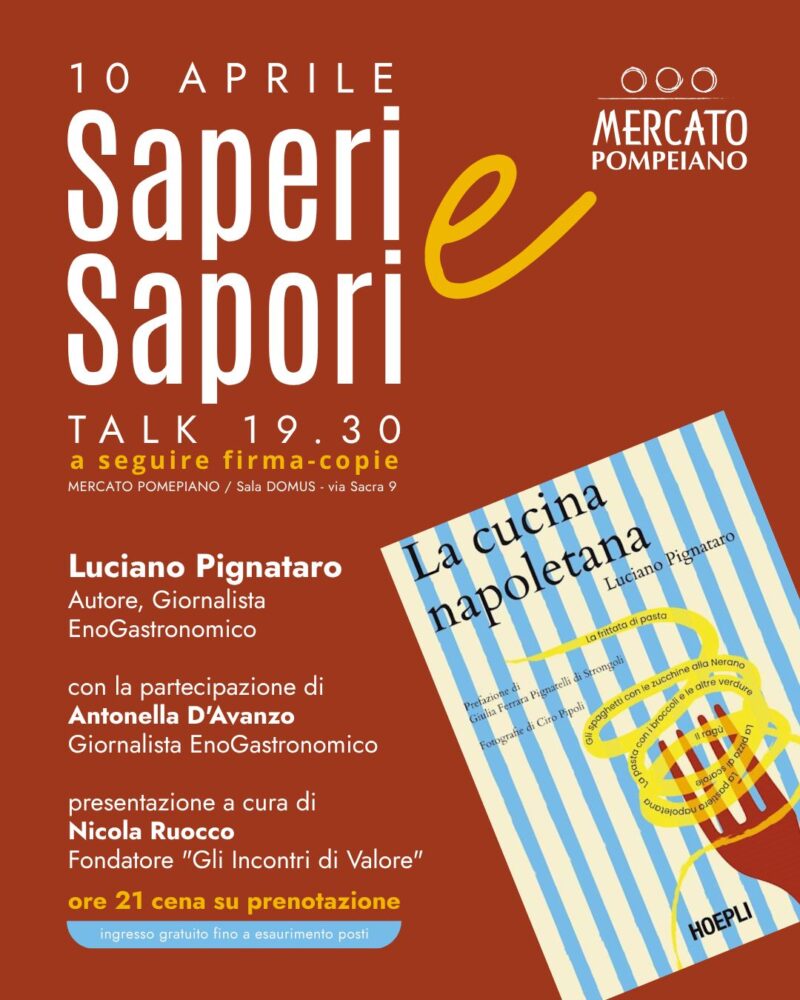 Il patron di Mercato Pompeiano Gaspare Coppola sottolinea come “questa serata rappresenti il cuore della nostra missione: unire storia, cultura e gusto, offrendo ai nostri ospiti un’esperienza autentica e sensoriale che celebra la ricchezza della tradizione napoletana.” Appuntamento quindi venerdì 10 aprile, ore 19,30 presentazione del libro; a seguire, su prenotazione, cena serale dedicata.