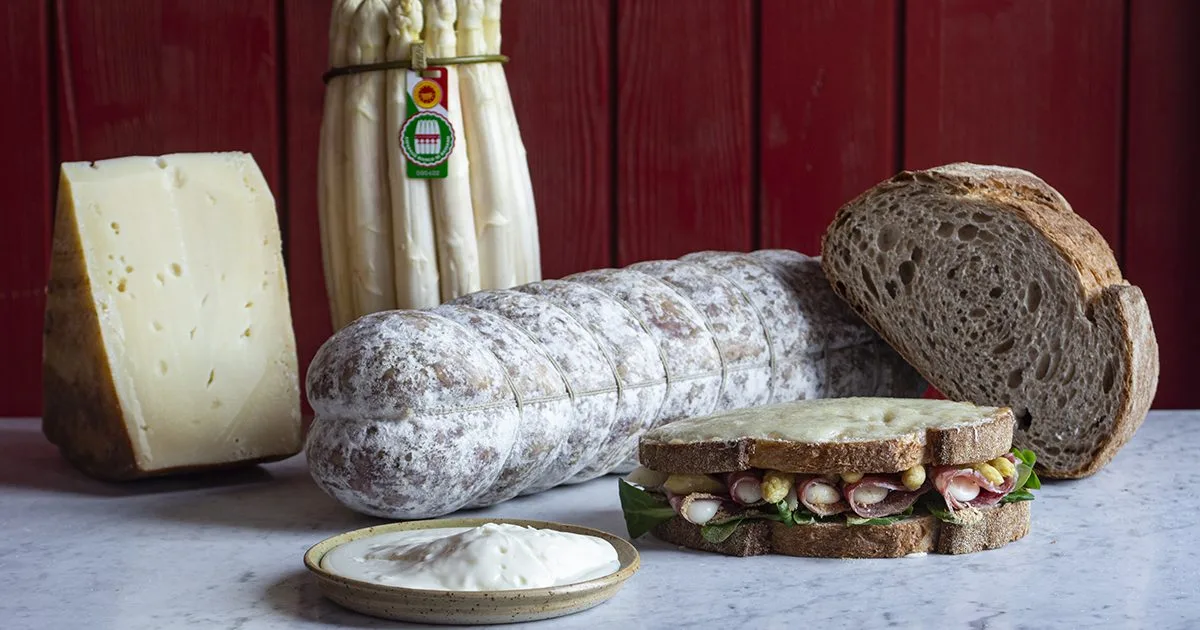 Pelare gli Asparagi bianchi di Bassano DOP , tagliarli a fettine di 1-2 millimetri e spadellarli a circa 45 °C con olio extravergine di oliva. Nel frattempo, essiccare gli scarti della pelatura degli Asparagi bianchi di Bassano DOP e ridurli in polvere. Tostare in forno caldo a 230 °C due fette del nostro pane integrale, una insieme all’Asiago d’Allevo DOP grattugiato e l’altra neutra, per 2 minuti. Successivamente, stendere la Soprèssa Vicentina DOP e farcirla con la Casatella Trevigiana DOP. Adagiare sulla prima fetta di pane neutra la valeriana, le fette di Soprèssa Vicentina DOP ripiegate a metà, gli Asparagi bianchi di Bassano DOP tiepidi e chiudere il panino con la fetta di pane gratinata con Asiago d’allevo DOP (con la parte cosparsa d’Asiago verso l’esterno). Concludere il tutto con una spolverata di Asparago bianco di Bassano DOP in polvere.
