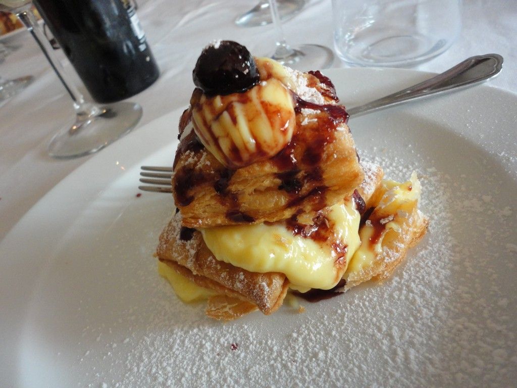 Si prosegue con il famoso baccalà alla pertecaregna, molto semplice ma gustoso. Chiudiamo, anche perchè è ora di ritornare a Montemarano al convegno, con una millefoglie alla crema pasticciera.