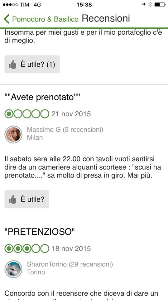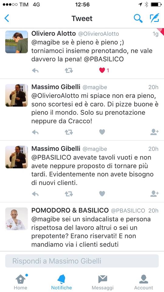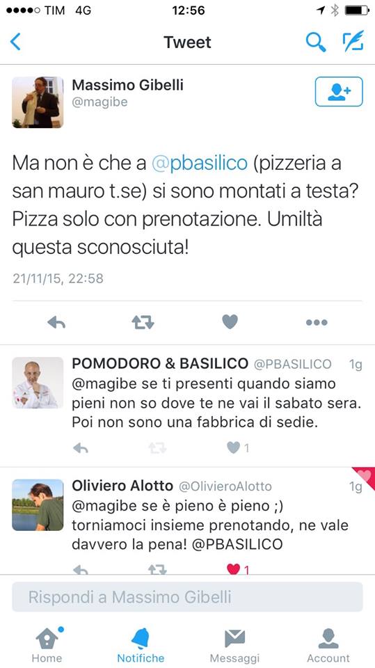 Dopo una manciata di minuti scrive su Twitter: “Ma non è che da @pbasilico (pizeria a san mauro t.se) si sono montati a testa? Pizza solo con prenotazione. Umiltà questa sconosciuta!”