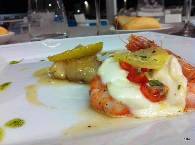 E i gamberi di Gallipoli con mozzarella di bufala, pomodorini confit e qualche goccia di olio di basilico. Insolita presenza, la bufala, quaggiù dove regnano fiordilatte e giuncata. Ma riuscita per la grazia vellutata del boccone e la rotondità dei sapori.