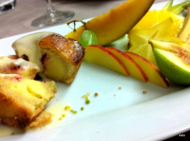 Un pasticciotto leccese, ripieno di amarena oltre che di crema pasticcera. Quasi un napoletano bocconotto. E tanta frutta d’oltremare.