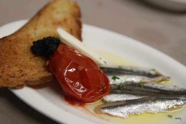 Poi le alici marinate alla menta con uova di lompo, pomodoro e burro.
