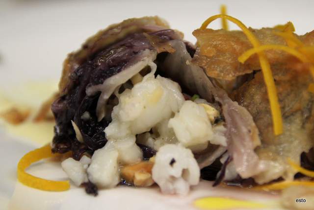 Accanto c’è l’involtino di radicchio, amaricante quanto si chiede, che accoglie una brunoise di code di gamberi e mandorle. La maionese dà la piacioneria appena esaltata da un ristretto di arancia.
