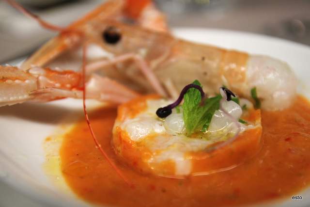Il gazpacho di peperone con la tartare di gamberi stanno insieme al crudo scampo. Ed è una bella festa. Piccantina piacevolmente per i germogli di rafano e il peperoncino.