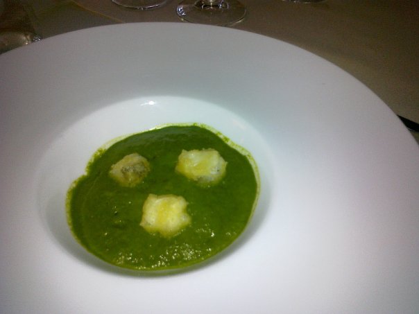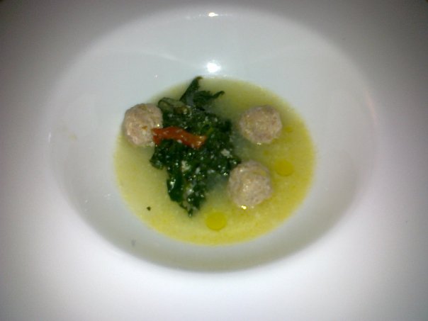 Questo Benvenuto di polpettine di calamari e seppie in brodo di gallina aromatizzato con rafano giovane e foglie di carciofo è corroborante, fantastico, rasenta la perfezione assoluta grazie al gioco di consistenze dovuto alla destrutturazione della materia regalata dal mare.