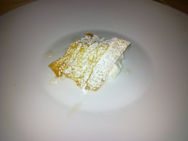 Infine il dolce, anzi il passaggio dal dolce al salato con la chiacchiera su spuma di canestrato di Moliterno.
