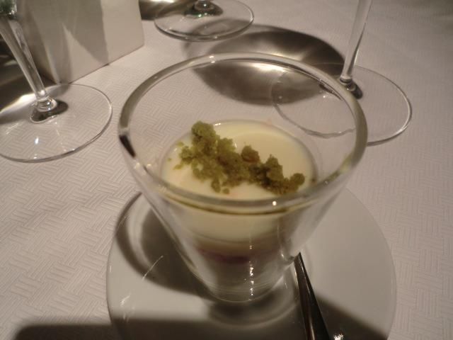 Frank Rizzuti. Preludio d'estate: crema ghiacciata al cioccolato bianco con sorbetto di lavanda. Crumble croccante al èistacchi o di Bronte, sfoglie di meringa, gelee di pompelmo e pepe rosa