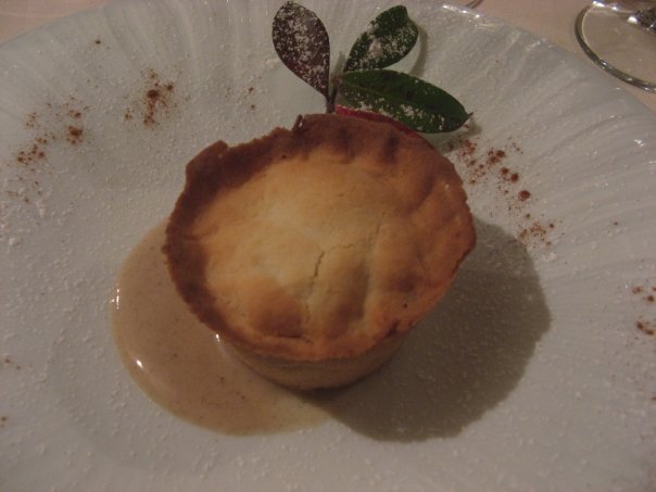 Con farina, burro, zucchero ed i tuorli preparare la pasta frolla e lasciar riposare in frigo per 6 ore. Imburrare ed infarinare 12 stampini di 4 cm. di diam. Stendere la pasta frolla non troppo sottilmente e rivestire gli stampi, stendere sul fondo un cucchiaio di crema di mandorle, distribuire uniformemente cubetti di mele ed in cima adagiare un cucchiaio di marmellata di albicocche, richiudere il tortino con un disco di pastafrolla di 4 cm. di diametro. Cuocere in forno preriscaldato a 180° fino a quando saranno lievemente dorati. Adagiare il tortino sul piatto di portata con salsa inglese profumata alla cannella.