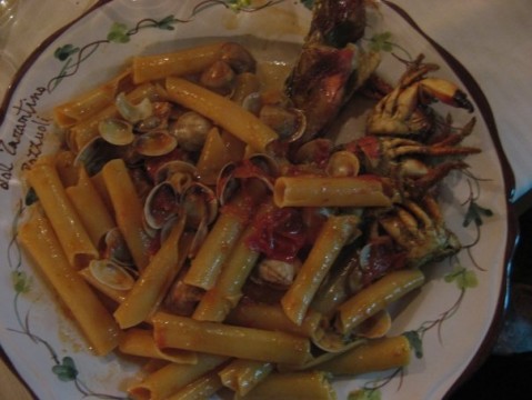 300 gr. di candele, 800 gr. di scorfano, 2 granchi di media grandezza, 500 gr. di lupini, 500 gr. di pomodorini del piennolo, uno spicchio d’aglio, olio extravergine d’oliva e sale q.b.