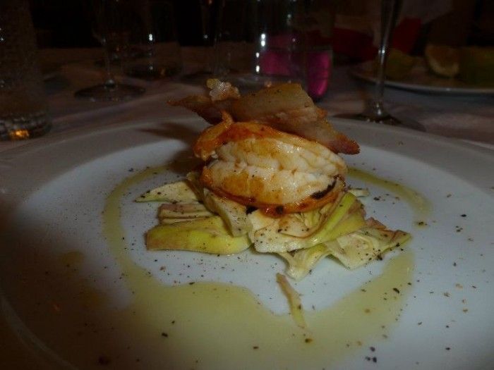 Infine , gamberone su letto di carciofi e bacon gratinato.