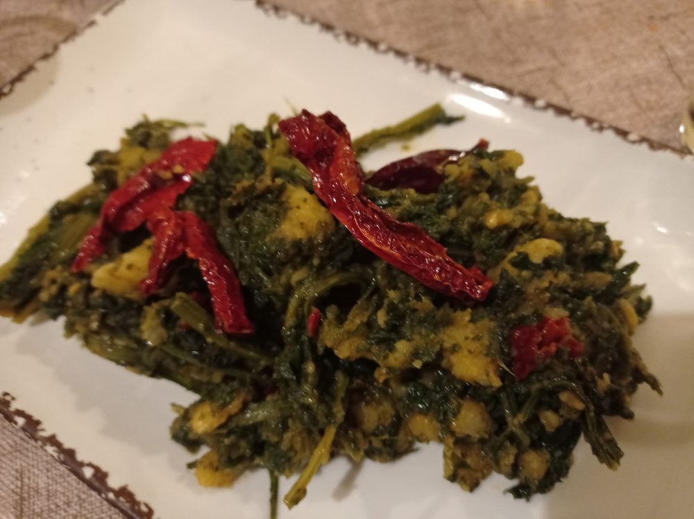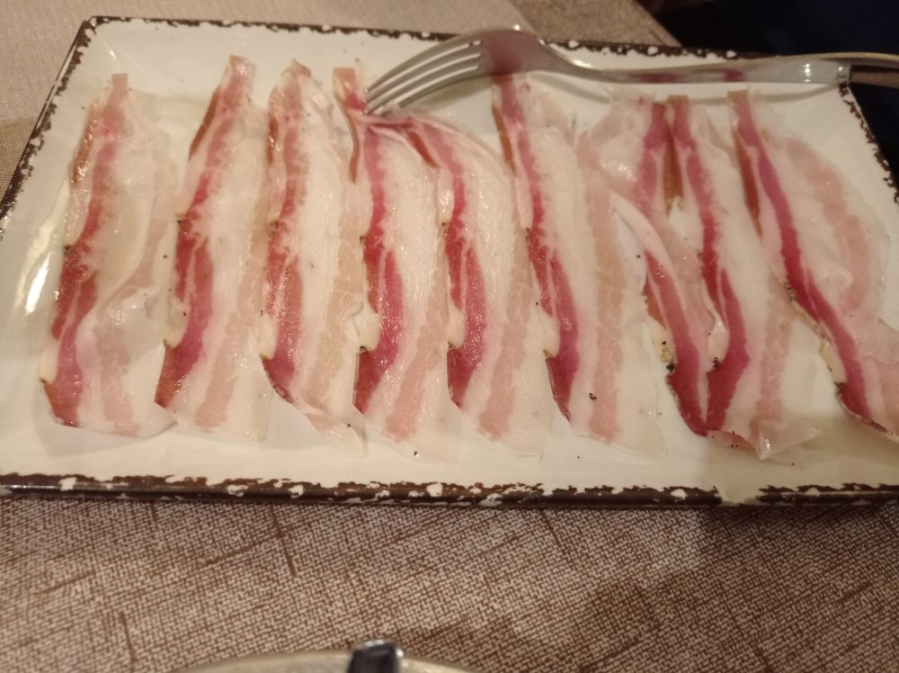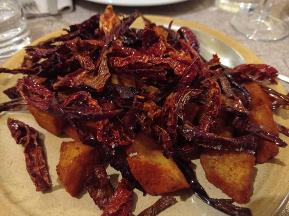 Ceci fritti serviti con pancetta tesa, seguiti poi da tarassaco con patate e peperoni cruschi. Tutto ottimo e saporito.