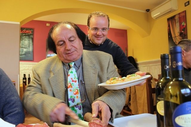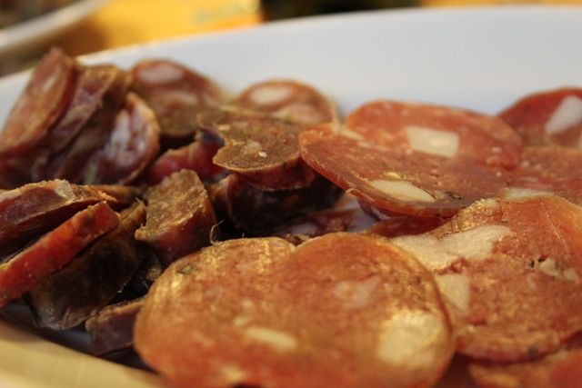 Luciano Di Meo ha portato la sua pezzentona, il salame fatto con tutti i tagli minori, escluso milza e fegato, del maiale nero, agliata, profumatissima, insaccata nel colarino.
