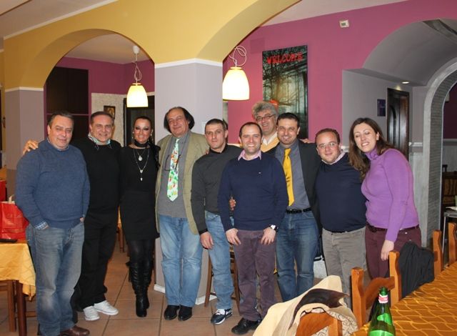 Gruppone di amici invitati da Pasqualino Rossi intorno al tavolo nella sua Pizzeria Élite in quel di Alvignano.
