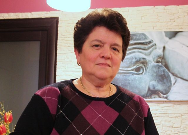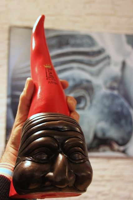 Maria Cacialli approfitta della pausa e regala il Corno-Logo a Pasqualino.