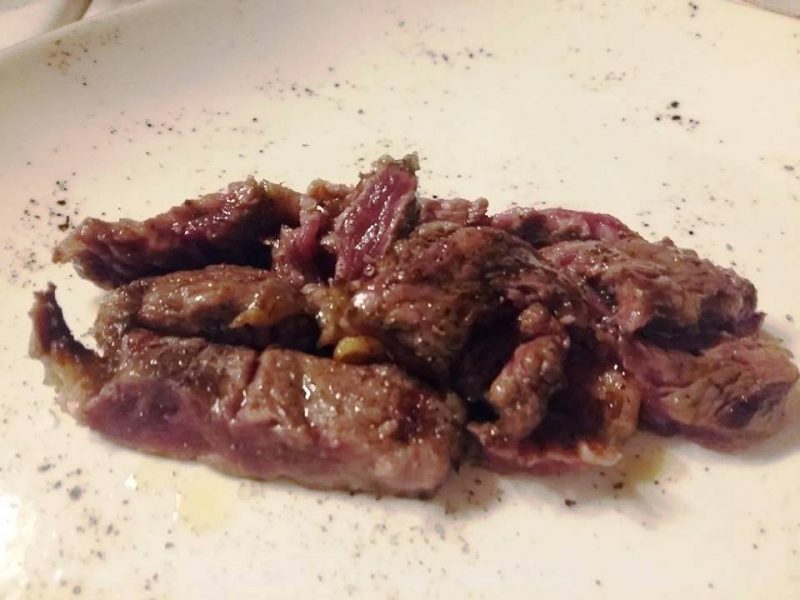 Un’osteria vera, colta, che affonda le sue radici nella tradizione e fa della sostenibilità con circa l’80% delle cose che trasforma, prodotte in proprio, il suo punto di forza. Ormai è sempre più chiaro che la materia prima farà la differenza. Si può obiettare che questo discrimine c’è sempre stato. Vero. Ma il punto è che va avanti chi più riesce a tornare indietro, e per farlo ha bisogno di conoscenza, cultura, rispetto delle normative. Uno sforzo enorme che una volta raggiunto il risultato premia senza dubbio chi ci ha creduto. La carne del collo di vacca vecchia, conservata nella sugna e poi passata sulla griglia, materia prima vera, quasi violenta nel sapore.