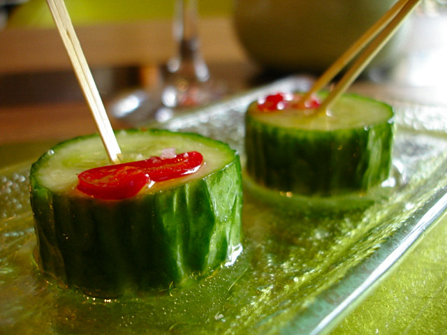 E se si cita Ducasse e Troisgros come dimenticarsi di Joel Robuchon. Questo cetriolo dall’apparenza banale rappresenta invece una bellissima sorpresa perchè la marinatura in agrodolce e il rilievo piccante del peperoncino rendono questa piccola cosa un grande snack, un eccellente aperitivo, un ricamo , un cesello vegetale raffinatissimo.