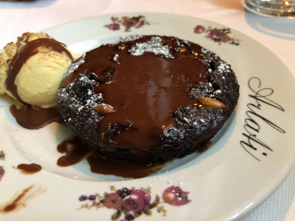 Premiata Trattoria Arlati, torta paesana, la direttrice indica Sesto e la Brianza, per cui pane, cioccolato, latte e pinoli, successivamente il piatto, che nasce povero (senza nemmeno il cacao) si arricchirà di uvetta, cedro candito, amaretti e biscotti, ben eseguita questa versione di antica tradizione accompagnata dal gelato alla crema, per l’accompagnamento musicale di Lucio Battisti, purtroppo, viaggiamo con qualche anno di ritardo…