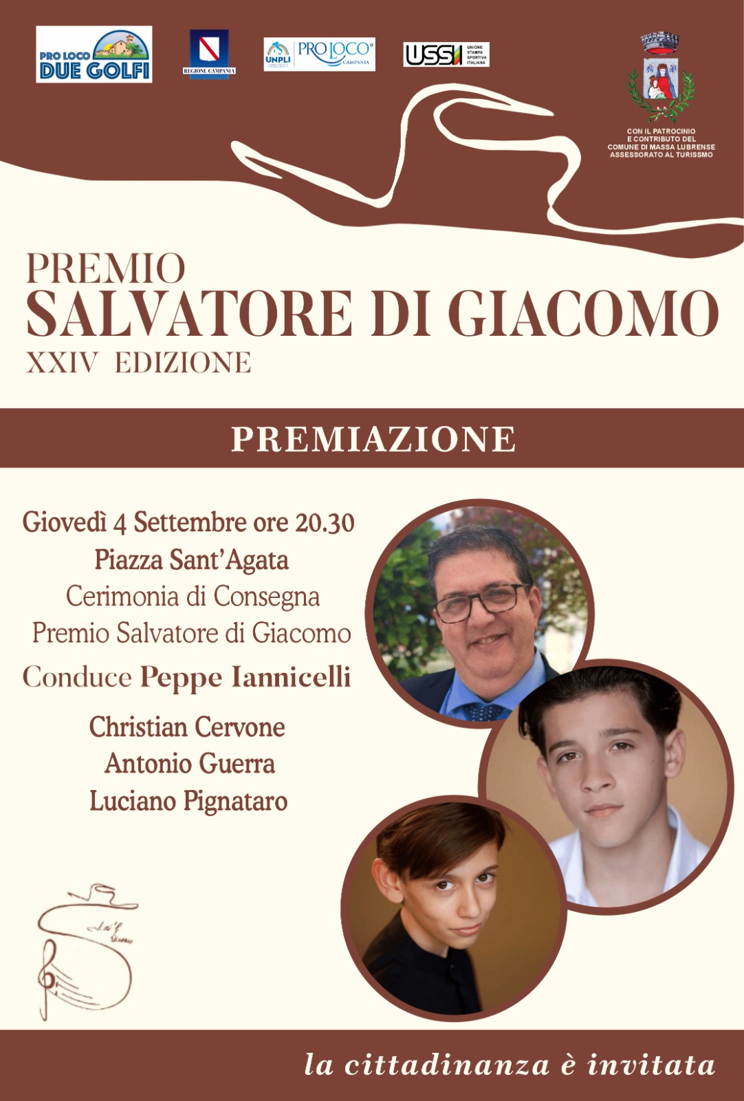Il cartellone degli eventi estivi a Sant’Agata sui Due Golfi, nel segno di un appuntamento ormai divenuto tradizione. Giovedì 4 settembre, alle ore 20.30, in piazza Sant’Agata si terrà la cerimonia di consegna del Premio Salvatore Di Giacomo 2025, giunto alla sua XXIV edizione. La rassegna, organizzata dalla Pro Loco Due Golfi con il patrocinio del Comune di Massa Lubrense, rappresenta uno dei momenti capace di fondere memoria poetica e valorizzazione delle eccellenze contemporanee.Sul palco, condotto da Peppe Iannicelli, riflettori puntati sugli insigniti di quest’anno: il giornalista Luciano Pignataro e gli attori Antonio Guerra e Christian Cervone. Una scelta che rispecchia lo spirito della manifestazione, da sempre tesa a intrecciare linguaggi differenti – dal giornalismo al teatro, dalla letteratura alla poesia – mantenendo vivo il legame con il grande poeta napoletano cui è intitolata.