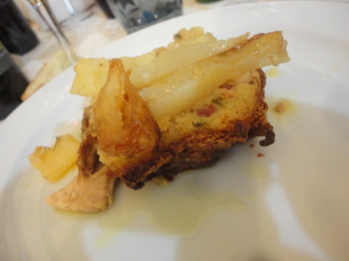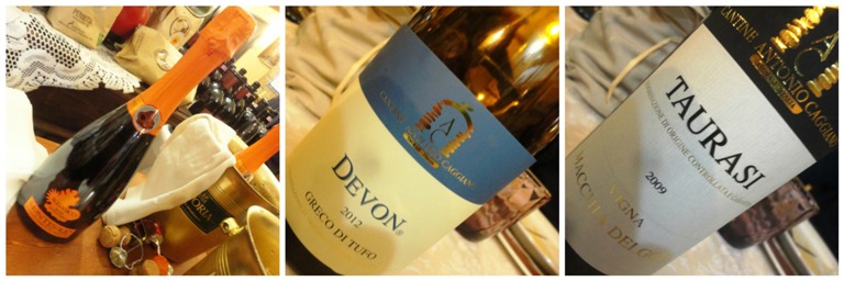 Ottima materia prima, bel gioco di consistenze tra il ripieno, la carne e la crosta esterna croccante. E sul beveraggio qui, non si è capito più niente…abbiamo sentito prima l’Irpinia Aglianico 2012 Taurì e poi il Taurasi Vigna macchia dei Goti 2009, ambedue di Cantine Caggiano. Stile raffinato, uso sapiente e dosato dei legni, tannini levigati e bella complessità olfattiva. Si chiude con il magnum di “Taurasi” del Cav. Alvino, che a mio avviso è risultato uno dei migliori delle serata…Che dire, un bel gruppo, molto affiatato, con le idee chiare, ma soprattutto con la voglia di andare avanti con caparbietà e con orgoglio. Stringono i denti e resistono…”adda passà a’ nuttata”!!!