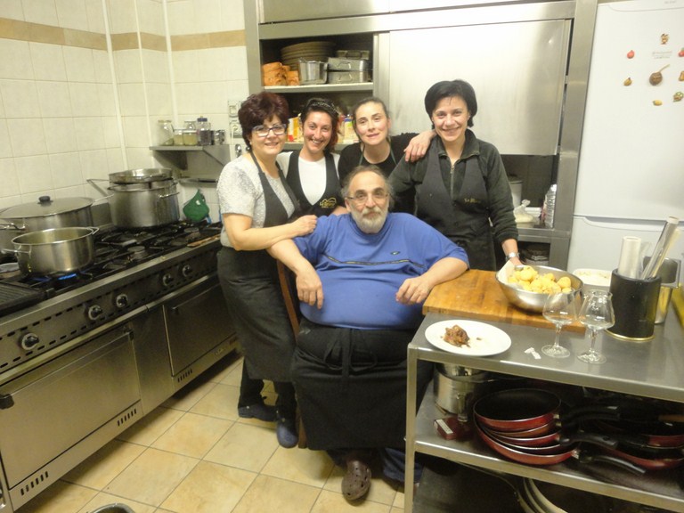 E qui si beve un Devon Greco di Tufo docg 2012 Cantine Caggiano che ha provveduto con l’acidità e l’agrumato a riequilibrare il piatto, vino ben costruito e di notevole complessità olfattiva, anche tropicale. In rapida successione gustiamo la Minestra maritata all’arianese poche verdure ma buonissime, la carne“ maritata” alle verdure è costituita solo da alcuni pezzettini di prosciutto spolpati immediatamente sull’osso. Oserei definirla la “versione light” della classica. Per il beveraggio procediamo ancora con il Devon. Passiamo alla Polenta al ragù di tracchie, cotechino ed involtino di cotica, questa proprio peccaminosa!!! Una goduria esagerata, insieme ai commensali propinqui (Giacomino ed Annibale) abbiamo attinto più e più volte al vassoio integrativo delle tracchie che la sig.ra Carmelina (moglie di Guglielmo Ventre). Se proprio dovessi trovare un difetto a questa polenta, avrei utilizzato una farina di mais dalla grana più sottile…ma comunque buonissima. E qui si beve rosso. Inizio dal Nero Latino 2010 e dal Don Ciriaco 2007 Mier Vini di Giacomo Pastore, vini “old style”nei quali si percepisce nettamente il carattere dell’aglianico e l’uso di legni tradizionali quali il castagno. L’abbinamento che ho trovato più armonico è con il Nero Latino.