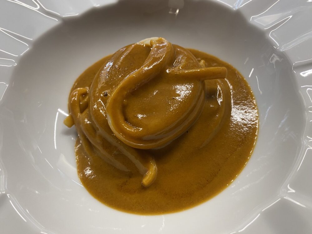 I primi piatti sono autenticamente golosi e almeno tre meritano un voto altissimo: linguine con peperone crusco e melanzane; spaghetto Graziano con anguilla affumicata, scarola e quinoa (qui il vento di Villa Crespi soffia eccome), Linguine con aragosta e salsa di champagne, così classicheggianti da far versare fino una lacrimuccia. Ancora aragosta come secondo, con miele e miso; e un interessante baccalà con la sua trippa e cipolla affumicata.