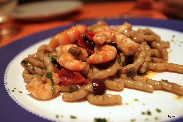 Poi i fusilli fatti a mano con mazzancolle olive e capperi.