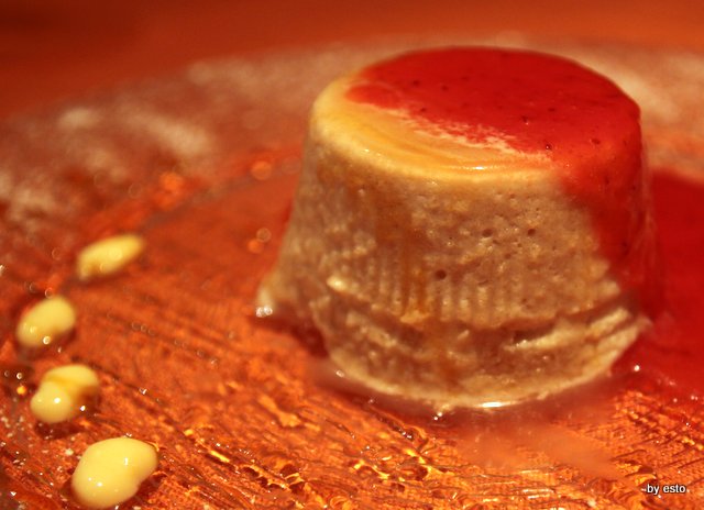 Qualche dolce di maniera come la bavarese di mela verde con salsa di fragole.