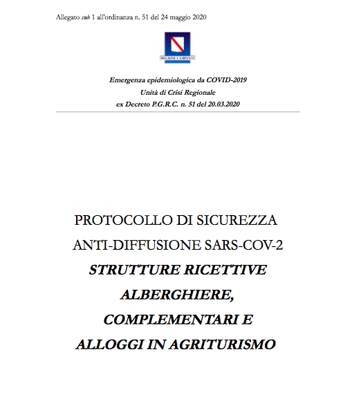 Il presente documento è redatto dalla Unità di Crisi della Regione Campania giusto DPGR n. 51/2020 viste le risultanze degli incontri di ascolto e delle proposte pervenute dalle principali associazioni di categoria e singoli albergatori, con l’obiettivo di fornire linee guida da adottare al fine di mitigare il rischio di trasmissione del contagio da Covid-19 all’interno delle strutture turistico ricettive, con l’obiettivo di tutelare la salute degli ospiti e dei collaboratori.