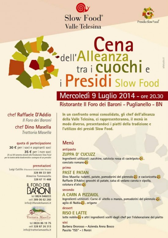 La cena si svolge a Puglianello, che non è Napoli né sua provincia; gli chef in questione sono beneventani; il presidio sloow food è della valle telesina (provincia di Benevento, anch’essa)!