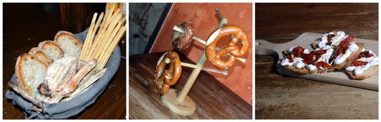 Historia Birreria, l’ingresso, il cestino del pane, brezel e bagel e bruschette con mousse di ricotta di bufala e porcini, pomodori semi-dry e finocchietto