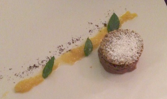 Si chiude con il Conciato di Manuel: cheese cake al conciato romano e more, decorato con foglioline di menta. Un dolce complesso ma interessante: c’è la mousse di conciato romano, in equilibrio con la dolcezza per niente stucchevole delle more e, infine, la menta che conferisce freschezza alla sapidità del formaggi. La mia compagna di tavolo, ha preferito la millefoglie con pasta frolla al caffè, mousse di gianduia con nocciola e cioccolato e agrumi cotti sotto cenere.