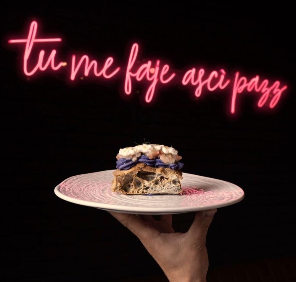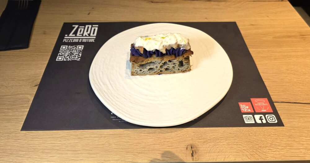 Iniziamo la nostra degustazione (che verrà introdotta a breve nel format della pizzeria) con Eleganza Viola, ovvero una focaccia con tartare di gambero viola su crema di patate viola, con stracciatella al limone e salsa al Franciacorta, olio evo “Oro di Caiazzo”.