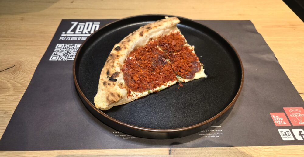 Sottosopra: Alla base: basilico e fiordilatte, salsiccia piccante artigianale stagionata di scottona, cialda di nduja e pomodoro, un giro d’olio evo a finire. Questo spicchio rientra senza dubbio tra i nostri preferiti. Ottima la salsiccia piccante di scottona ed i buona fattura anche la cialda di ‘nduja e pomorodo. A voler essere pignoli forse di quest’ultima ne sarebbe bastata una quantità minore per rendere il piatto non solo più bilanciato ma anche più elegante all’occhio. Senza dubbio l’abbiamo comunque apprezzata, rientrando, come scritto prima, tra gli assaggi da noi preferiti nella serata.