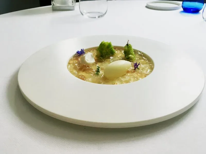 Irrorare il biscotto di olio all’erba cedrina. Mettere all’interno di un piatto piano la gelatina infusa di rosmarino, dei pezzetti di biscotto e due cucchiai di crema di bianco di limone. Terminare con il sorbetto di yuzu.