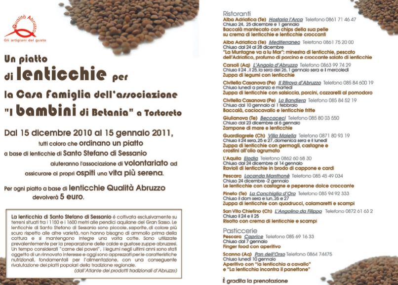 Da qui sono scaturite la promessa di un disciplinare che regolamenterà gli ingressi (e le uscite) degli associati, e l’attuazione della prima iniziativa solidale che è partita durante le feste natalizie: aggiungere in carta un piatto a base di lenticchie di Santo Stefano di Sessanio, prodotto tipico abruzzese e presidio Slow Food, per devolvere una percentuale di denaro raccolto alla casa famiglia a Tortoreto gestita dalla Onlus “I bambini di Betania”. L’iniziativa sulla carta finisce domani 15 gennaio, ma da alcuni ristoratori sarà prorogata per qualche altro giorno.