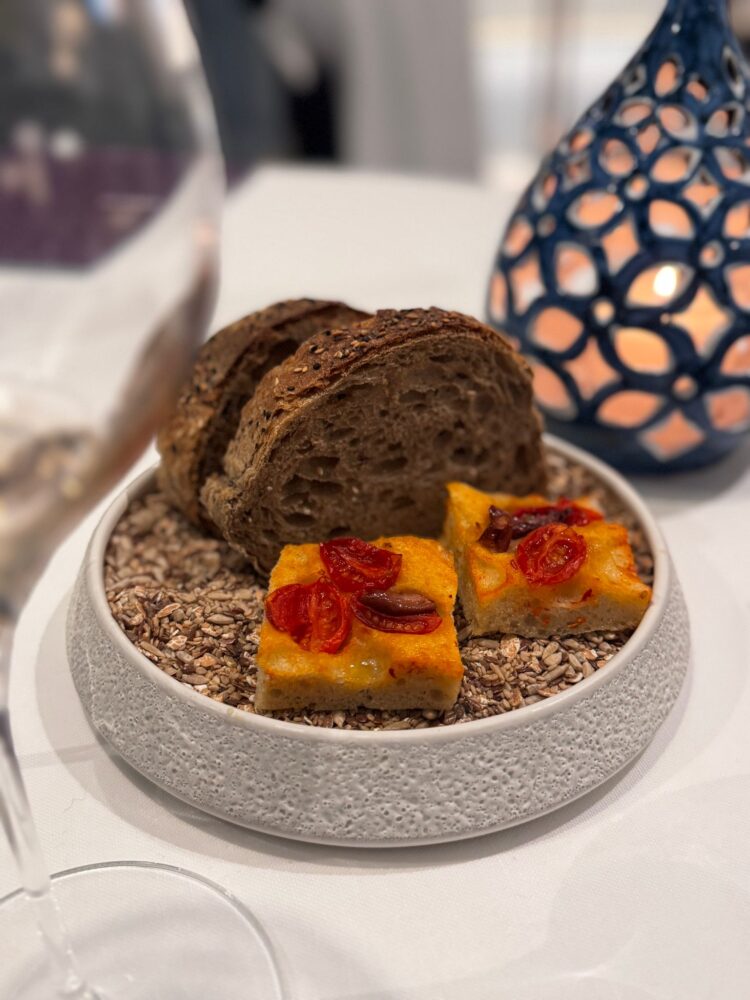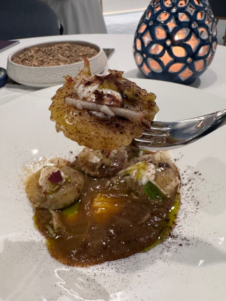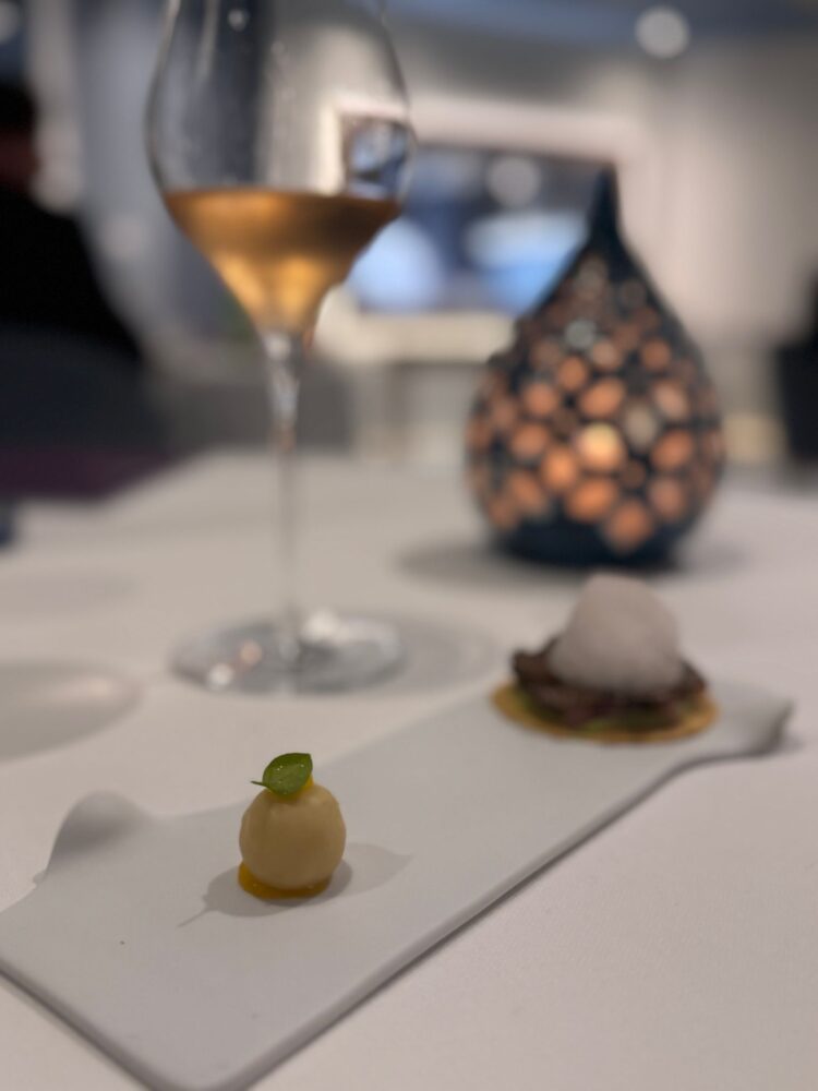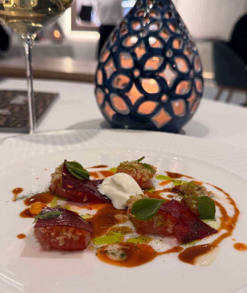 La cena si è aperta con un aperitivo vivace e sorprendente: una bruschetta di polenta con avocado, sgombro affumicato e spuma di pomodoro, seguita da una sfera di scampo e mandarino, l’abbinamento di sapori proprio di quest’ultimo è stato spiazzante ma decisamente indovinato. Entrambe le idee hanno dato un guizzo significativo all’apertura della cena.