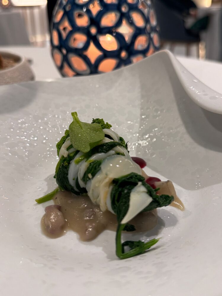 Il primo antipasto firmato Crisci ha offerto un piacevolissimo connubio di consistenze e aromi: gambero croccante al basilico, pelle di peperone in aceto, gelato di bufala e limone arrosto. Crisci non dimentica mai da dove è partito e omaggia sempre la sua terra d’origine in maniera esemplare. A seguire, Aversa ha presentato una seppia trasformata in un elegante involtino, abbinandola a broccoli neri e legumi di Controne: un piatto in cui ogni elemento ha dialogato senza sovrastare l’altro. Una portata questa con molta più sostanza che forma, come è stata definita dallo stesso Aversa. Entrambi gli antipasti sono stati accompagnati dal Trentenare IGP Paestum Fiano 2024, espressione autentica di un territorio sospeso tra mare e collina.