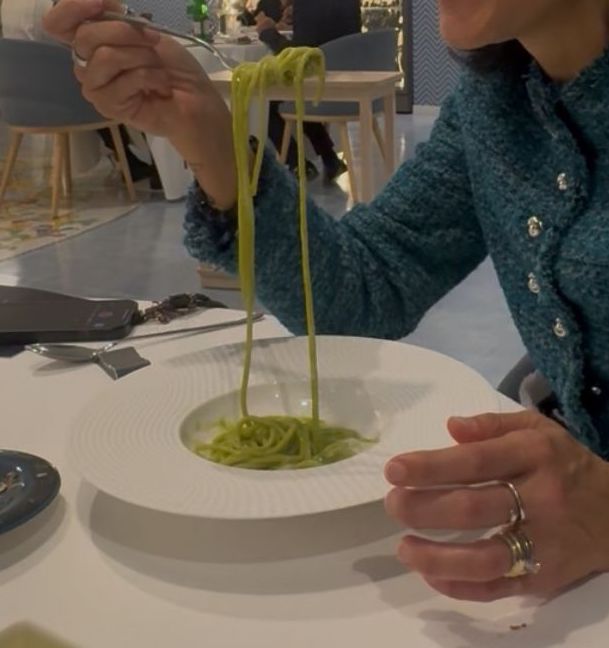 la pasta sottile si scioglieva al contatto con il palato, il sapore delicato della cipolla si è sposata benissimo con la mela e il cacao. È toccato a Crisci poi riportare il mare in tavola con uno spaghetto di Gragnano aglio, olio e acciughe reinterpretato in chiave contemporanea, arricchito da pesto in emulsione e spuma di pecorino.