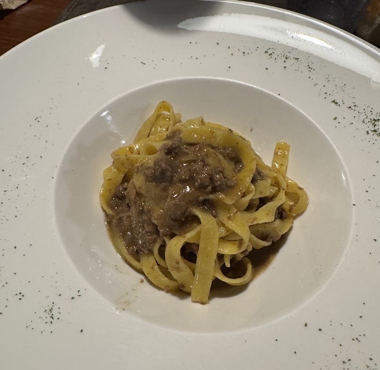 Un piatto che divide, ma che ha una voce chiara. La trota marinata con rösti di patate e maionese dello chef rassicura per pulizia e linearità, mentre la fantasia di verdure in varie cotture con spugna alle erbe di bosco e cialda di pane rivela una mano vegetale attenta alle consistenze, mai decorativa. Il tris di formaggi freschi con salsa alle olive nere, fiori di cappero e spuma al pomodoro chiude il reparto con una proposta corretta e ben costruita, forse più didattica che emozionale, ma coerente. I primi piatti sono il cuore identitario della cucina. Le fettuccine all’uovo con tartufo aestivum puntano sull’essenzialità: il tartufo accompagna senza dominare, lasciando spazio alla pasta e alla sua struttura. I canederli al burro e salvia parlano la lingua della montagna con autenticità, tra comfort e rigore.