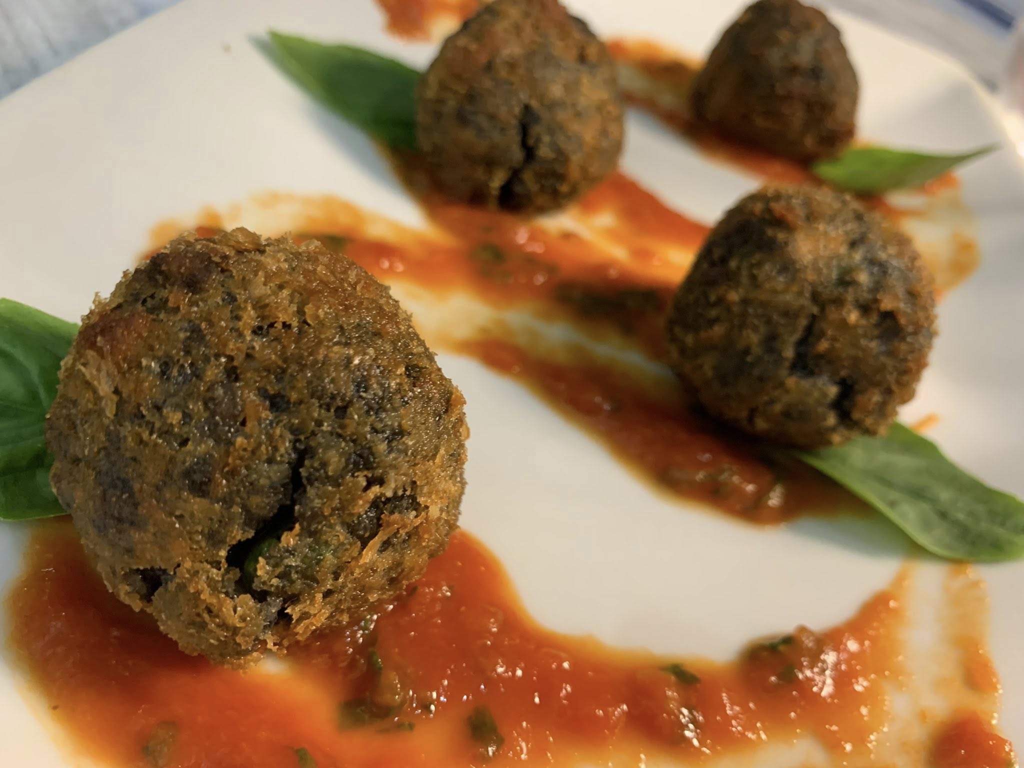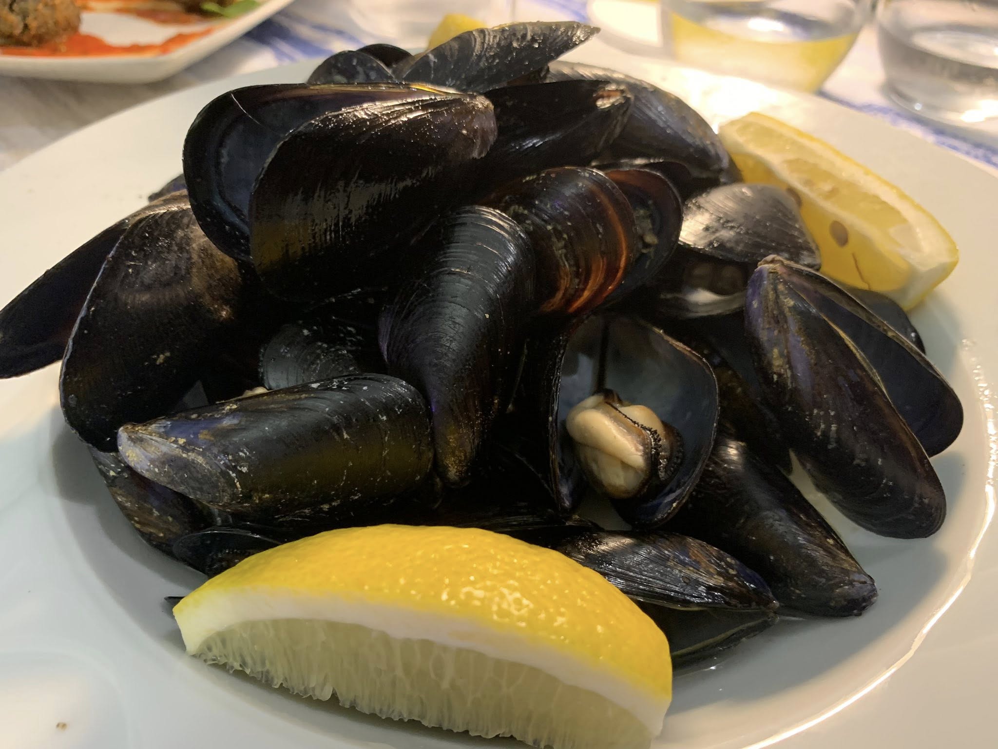 Tra gli antipasti si può scegliere tra classici soute di frutti di mare, impepata di cozze, insalata di mare, zuppa di cozze, bruschette oppure arancini al nero di seppia o, ancora crocchette con provolone del monaco fuso su rucola fritta (una delizia).