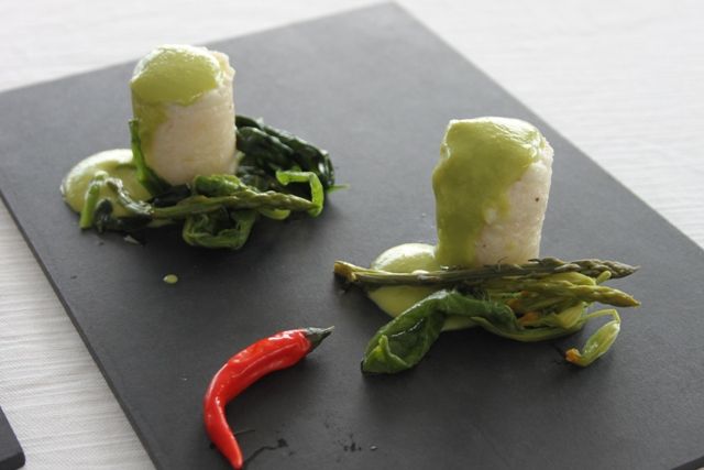 Nel piatto sono protesi come torri, qualcuna pendente: al parmigiano con erbette e asparagi di montagna caggianese, allo zafferano, al nero.