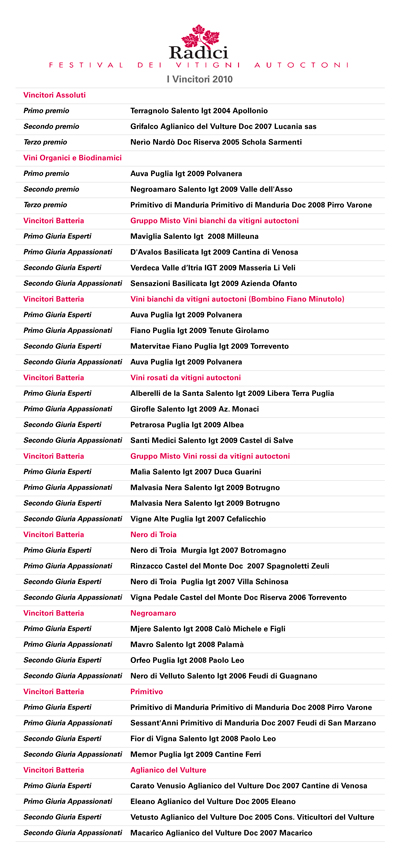 Monopoli, 8 giugno 2010. Una serata magnifica, profumata di estate e di ottimismo, quella che si è svolta nella splendida cornice del R&C Il Melograno e conclusa con l’assegnazione dei premi della V Edizione di RADICI Festival dei vitigni autoctoni.L’evento ideato ed organizzato dall’Associazione ProPapilla di Nicola Campanile e da Enzo Scivetti, sostenuto dall’Assessorato alle Politiche Agricole e dall’Assessorato al Turismo della Regione Puglia, ha visto 101 produttori portare in gara 178 etichette di vini prodotti da uve provenienti dalla coltivazione di vitigni autoctoni e storici caratteristici dei tanti territori che determinano la ricchezza ampelografica della nostra regione.