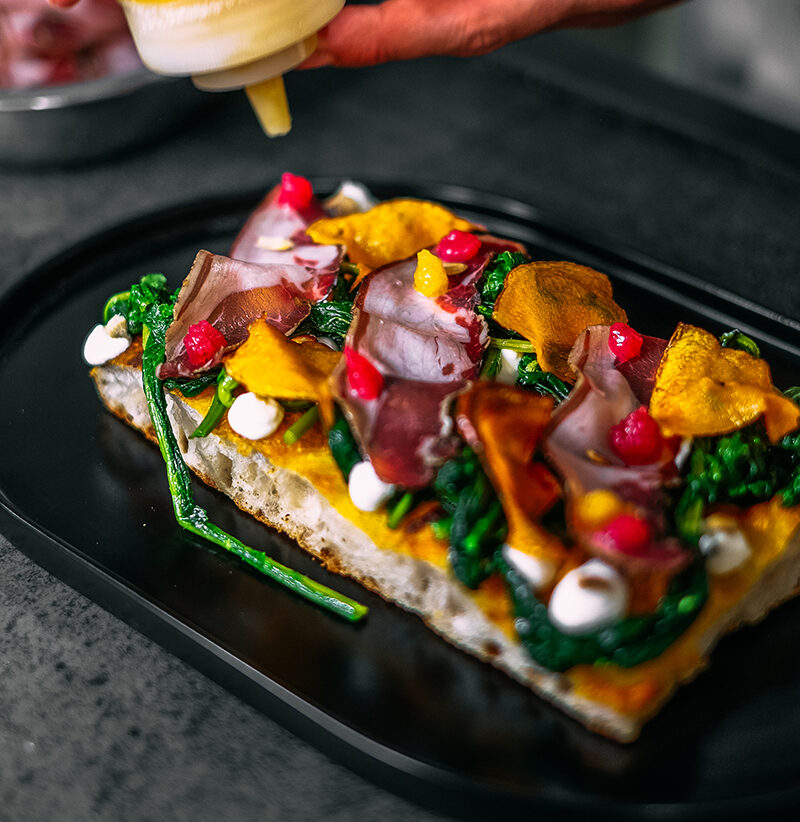 Questa ricetta nasce dal desiderio di raccontare l’autunno, preservando e valorizzando gli ingredienti, e utilizzandoli in modo creativo per ridurre al massimo gli sprechi. L’arancione della zucca e il rosso dello speck di bufala nostrano incontrano il violaceo vivo del melograno e il verde intenso del broccoletto. In questa sequenza di colori e sapori, ogni ingrediente mantiene la sua identità, provocando un’esplosione di gusto al palato. La pizza è quindi arricchita da crema di zucca, fior di latte, broccoletti ripassati, chips di zucca dorate, semi di zucca, Fior di Fuscella, speck di bufala nostrano, gel di zucca e di melograno.