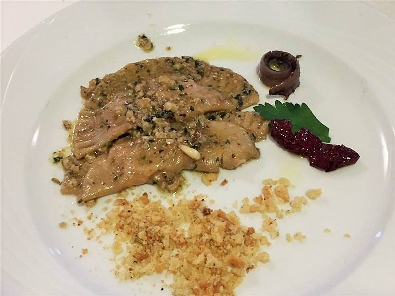 L’interno della mezzaluna è fatto di salsiccia, besciamella, zucca, funghi porcini mentre il sugo di condimento è composto da frutta secca e colatura di alici, come tradizione vuole.