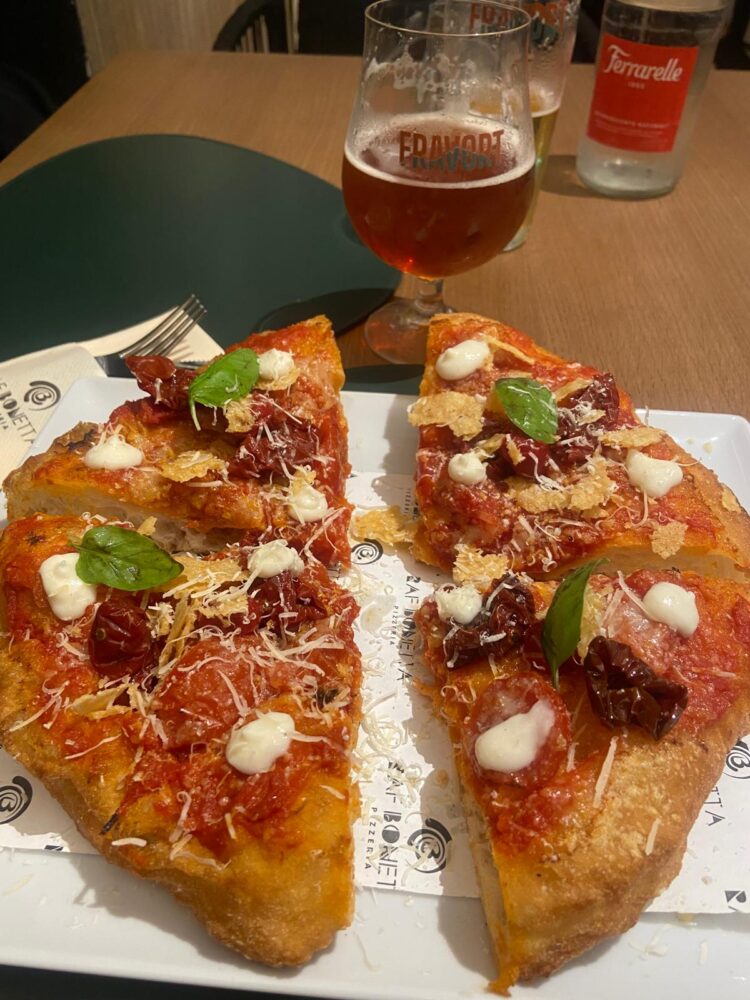 Simbolica ma non piccola differenza lessicale applicata al banco, che parla del percorso personale di Raffaele Bonetta, da anni concentrato sullo studio degli impasti – classico, integrale, gluten free – e delle cotture in forno, in pala, in padellino, in doppia fritta e al forno. Coerentissima con questi approfondimenti, la selezione di ingredienti di ottima qualità belli nei colori, che twistano l’aroma con il profumo del disco e abbinati con una generosità voluta per dare piacere ad ogni morso. L’olio accompagna suadente e rende protagonista ogni spicchio.