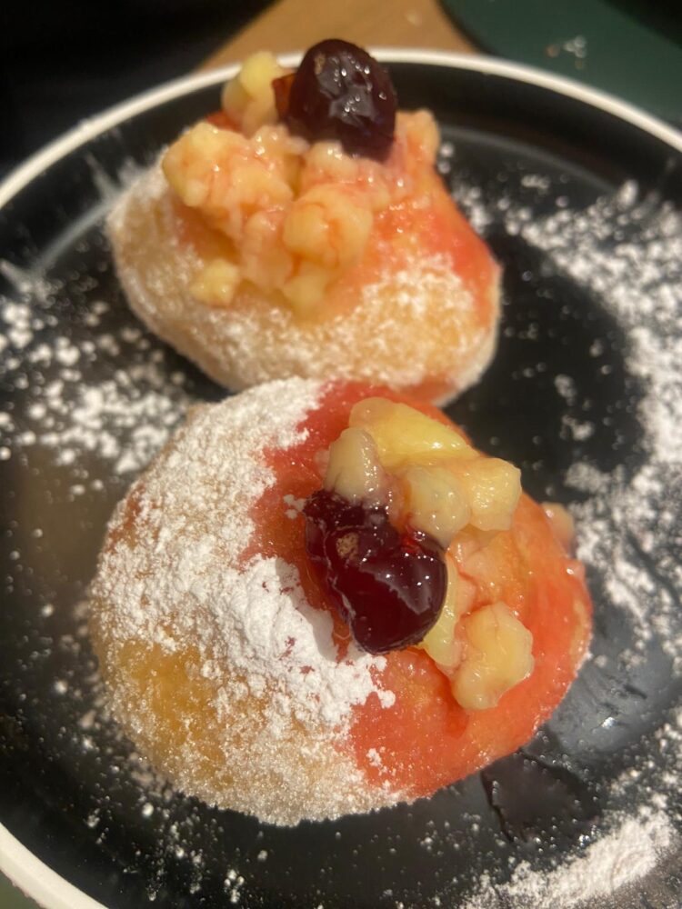Le chiusure dolci completano il percorso: l’Ischitana (pala tonda) con crema pasticcera, amarene, granella di amaretti e zucchero a velo, gioca su memoria e leggerezza mentre la Dolce Crunch (base di pizza in doppia cottura) con crema al mascarpone, albicocca pellecchiella, cioccolato fondente e zucchero a velo, lavora sulla contrapposizione tra struttura e morbidezza.