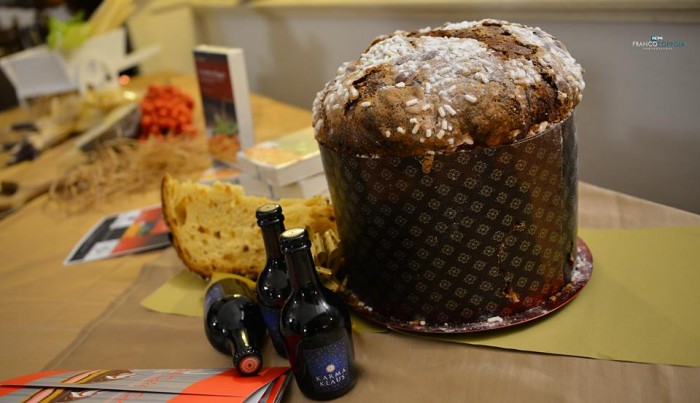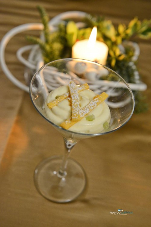 Dulcis in fundo, un tris di delizie: yogurt artigianale del mastro casaro Paolo Amato variegato con pezzetti di cioccolato fondente; pastiera di grano scomposta; panettone artigianale di “Make Dolci”.