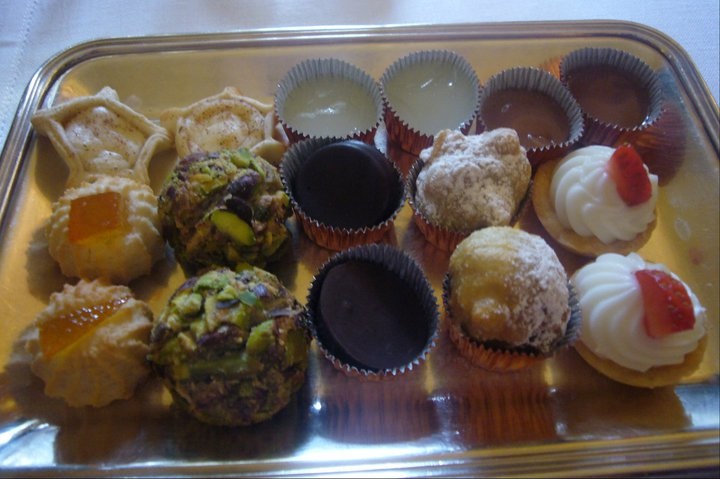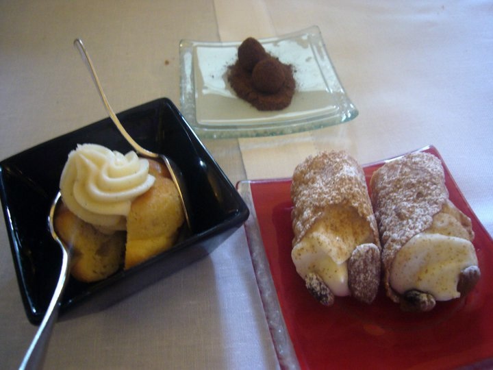 Terminiamo un sontuoso pranzo da ricordare nel tempo con una piccola pasticceria che in molti ristoranti sarebbe il dessert principale: cannoli, babà e mandorle cacao accompagnati da pasticcini e cioccolata di Modica.
