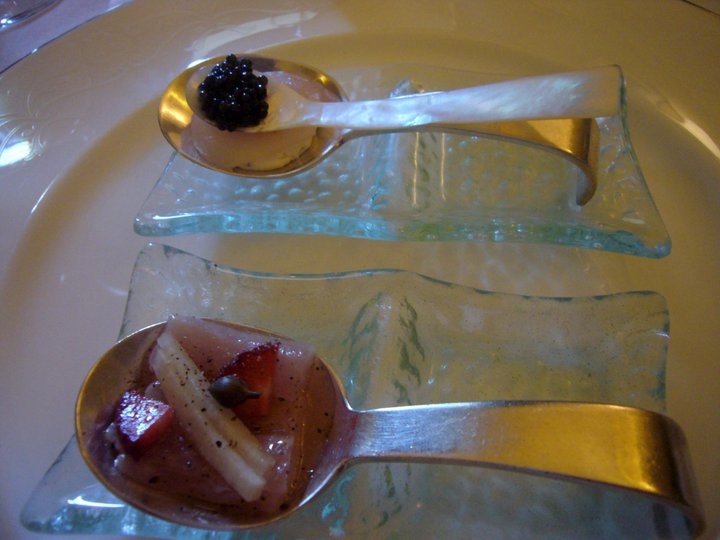 L’inizio è scoppiettante con cucchiai e bicchierini. Uno da caviale Asetra, ricotta, dentice crudo e miele di corbezzolo, l’altro da sugherello, fragola, cappero e melone gialletto.
